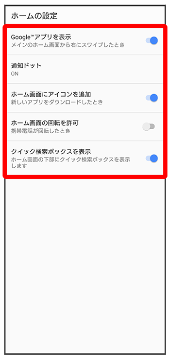 | クイック検索ボックスを表示 | ホーム画面の下部にクイック検索ボックスを表示するかどうかを設定します。アプリや連絡先などを検索したり、入力した語句を(Google)で検索したりできます。 |