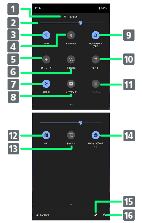 - アラーム設定状況やマナーモード設定状況などの情報を表示