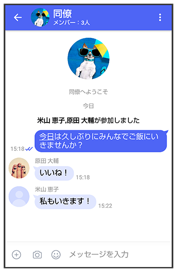 同じグループのメンバーに写真やスタンプなどが共有できます。