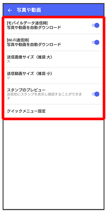 | [モバイルデータ通信時]写真や動画を自動ダウンロード | モバイルデータ通信時に受信した写真や動画を自動でダウンロードするかどうかを設定します。 |