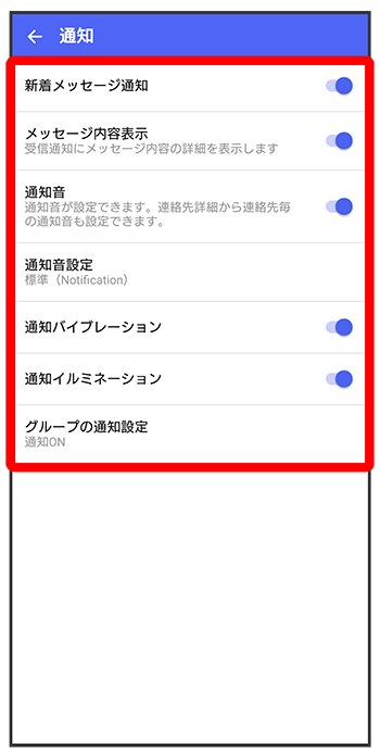 | メッセージ内容表示 | 受信通知にメッセージの内容を表示するかどうかを設定します。 |