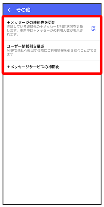 | +メッセージサービスの初期化 | 本体およびサーバー上にあるデータを削除できます。 |