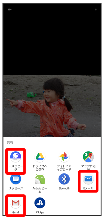 写真/動画一覧画面で、送信する写真/動画をロングタッチ(- 写真/動画をタップするたびに、選択(