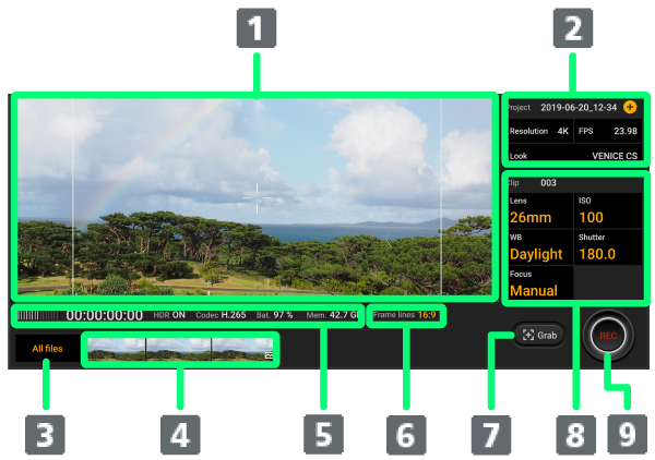 プロジェクト設定のパラメーターは、プロジェクト内のクリップを含めた、プロジェクト全体の映像の雰囲気に影響します。撮影したクリップはプロジェクトの中に保存されます。 - All files