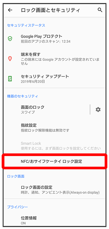 表示)にすると、画面ロック中にNFC/おサイフケータイ®機能がロックされます。画面ロックを解除している間、NFC/おサイフケータイ®機能を利用できます。