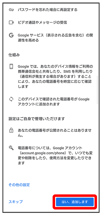 - セキュリティ保護目的でのみ電話番号を追加するときは、をタップします。以降は、画面の指示に従って操作してください。