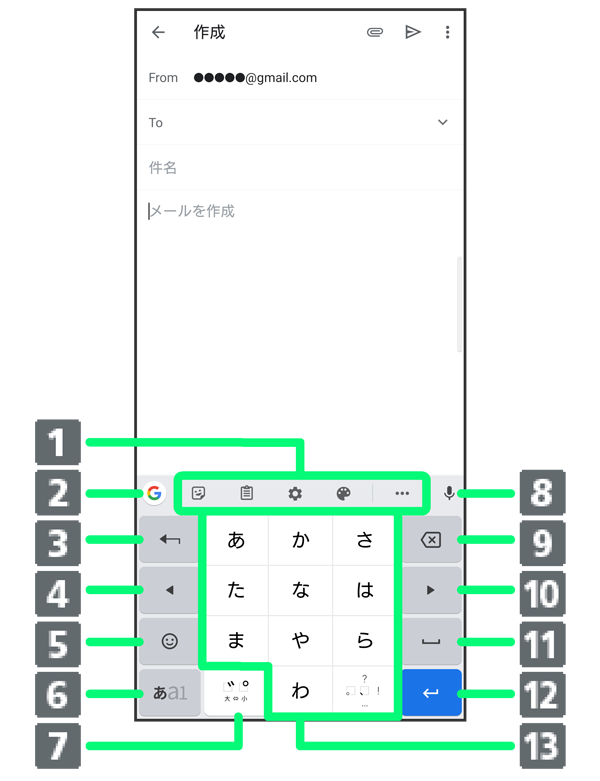 - 文字入力モードを切り替えます(かな/英字/数字)。ロングタッチすると文字入力の設定画面を表示したり、片手モードを設定したりできます。
