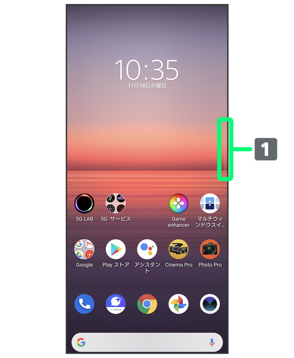 サイドセンスバーを上にスライドする(指でなぞる)とマルチウィンドウメニューが表示されます。画面を分割して2つのアプリを同時に表示できます。詳しくは、「マルチウィンドウ」を参照してください。