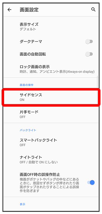 | ロック画面でサイドセンスを使用する | ロック画面でサイドセンスメニューを表示できるようにするかどうかを設定します。 |