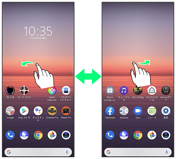 各ホーム画面シートをアプリのショートカットやウィジェットなどでカスタマイズして、便利に使用できます。ホーム画面を左右にフリックすると、ホーム画面シートを切り替えることができます。
