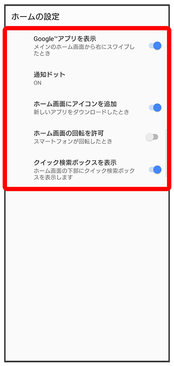 | クイック検索ボックスを表示 | ホーム画面の下部にクイック検索ボックスを表示するかどうかを設定します。アプリや入力した語句を |