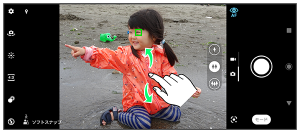 )をタップして、レンズを「望遠」/「標準」/「超広角」に切り替えたり、レンズ切り替えアイコンを横画面では上下にドラッグ、縦画面では左右にドラッグしても、ズームを利用できます。 - 音量キーの操作は、「音量キー設定」により異なります。お買い上げ時は「ズーム」に設定されています。
