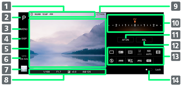 タップした時点で露出を固定できます。固定中はオレンジ色で表示されます。再度タップすると露出の固定が解除されます。 - 設定項目エリア