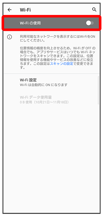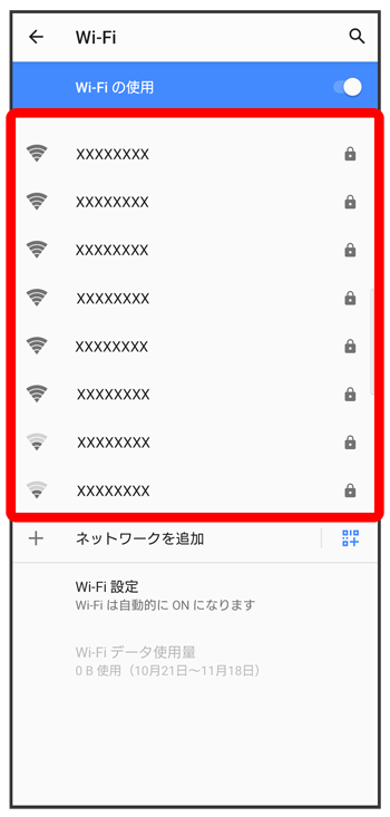 - Wi-Fi ネットワークがスキャンされます。スキャンが終わると、画面に利用できるWi-Fi ネットワークが表示されます。