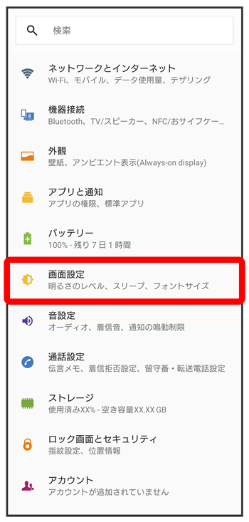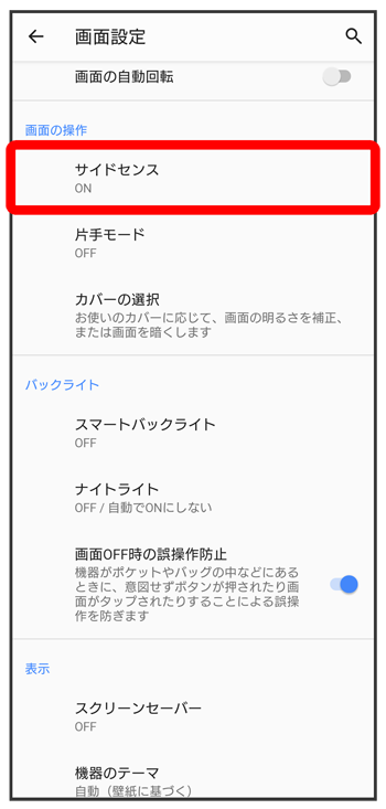 | 操作性 | ・ダブルタップの速さ サイドセンスが認識するダブルタップの速さを設定します。 ・スライドの長さ 上または下にスライドする(指でなぞる)操作の長さ(認識する距離)を設定します。 |