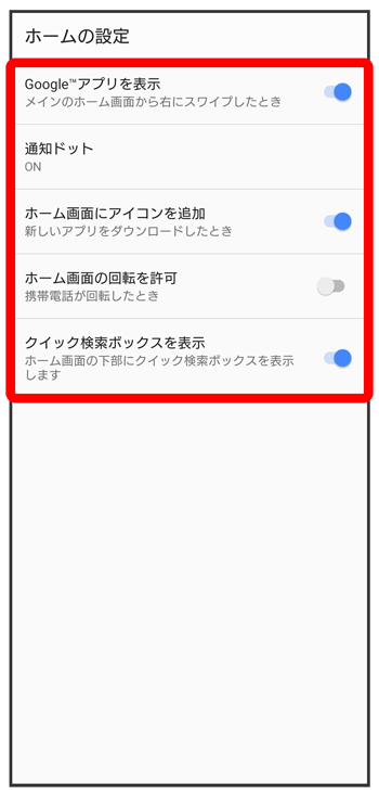 | クイック検索ボックスを表示 | ホーム画面の下部にクイック検索ボックスを表示するかどうかを設定します。アプリや入力した語句を |