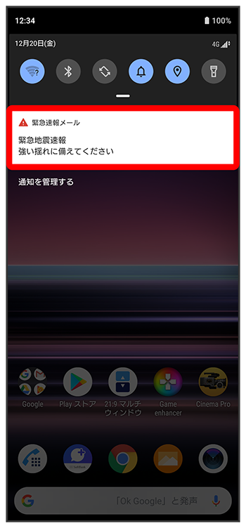 とメッセージが表示され、緊急地震速報の警告音/津波警報、災害・避難情報の専用着信音およびバイブレーションでお知らせします。