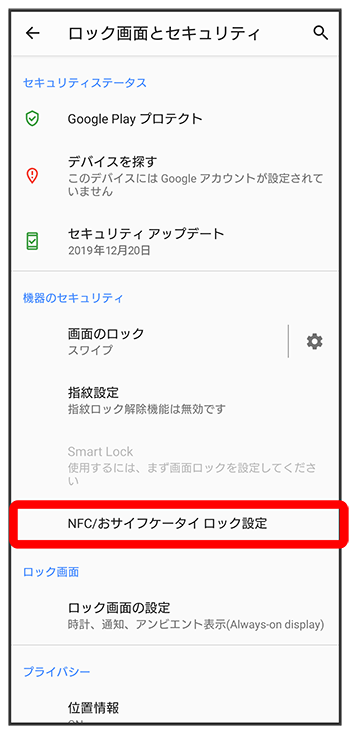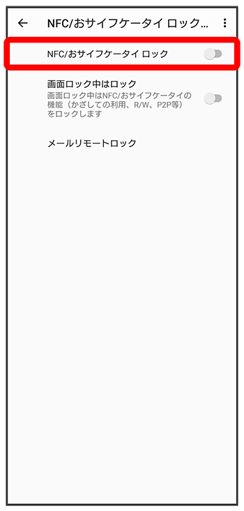 表示)にすると、画面ロック中にNFC/おサイフケータイ®機能がロックされます。画面ロックを解除している間、NFC/おサイフケータイ®機能を利用できます。