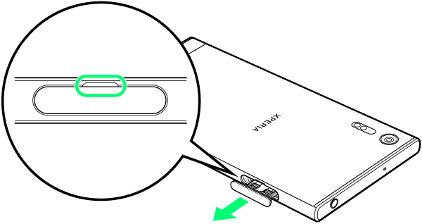 ミゾに指先をかけて、SIMカード/SDカード挿入口のカバーを引き出す