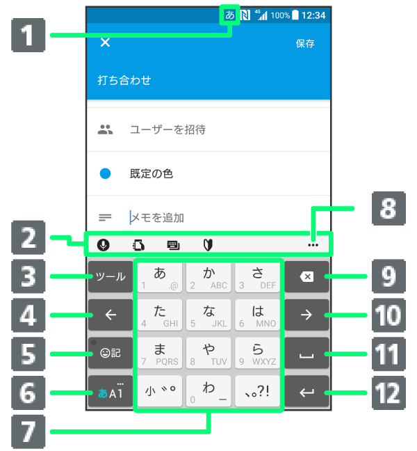 - 文字入力モードを切り替えます(ひらがな漢字/英字/数字)。ロングタッチするとツール一覧を表示します。