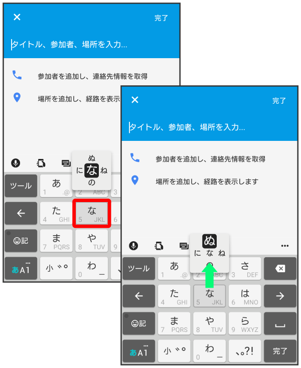 キーを上下左右にフリックすることで、キーを繰り返しタップすることなく、入力したい文字を入力できます。キーに触れると、フリック入力で入力できる候補が表示されます。入力したい文字が表示されている方向にフリックすると、文字が入力されます。