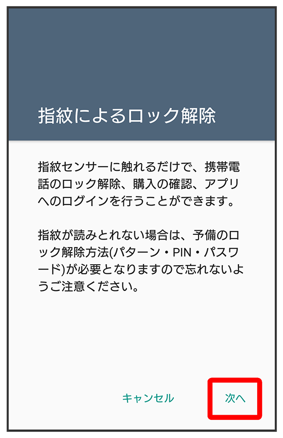- 設定した画面ロック解除方法は、指紋認証を利用できない場合に使用します。