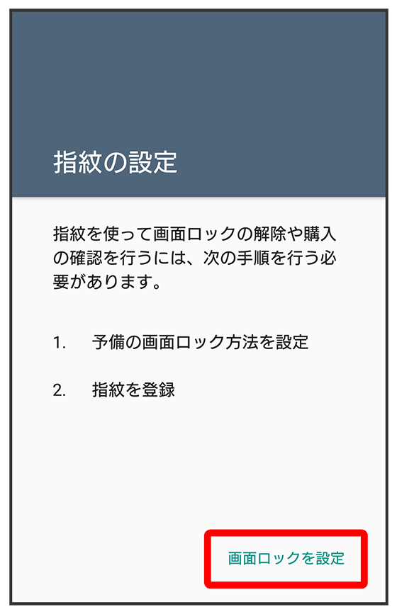 - 指紋を登録済みの場合は画面ロック解除の入力画面が表示され、画面ロック解除方法を入力すると指紋設定画面が表示されます。