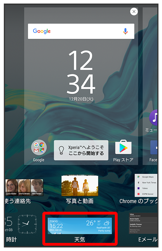 | Google Play Music | 曲の再生や一時停止、スキップの操作ができます。または、曲のシャッフル再生ができます。名称は同一で、大きさの異なるウィジェットがあります。 |