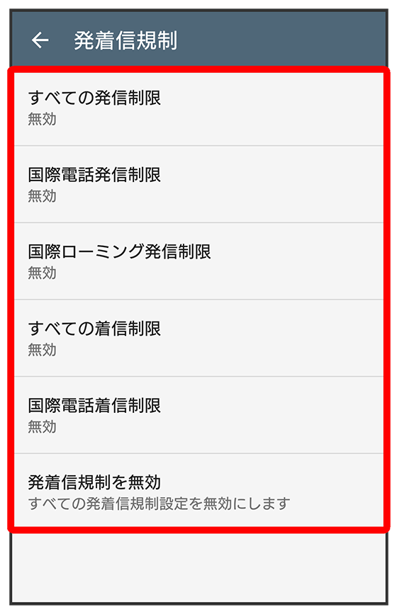- 発着信規制をすべて無効にするときは、をタップして、をタップします。