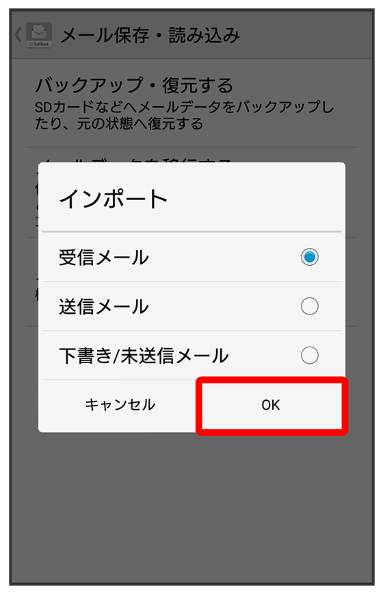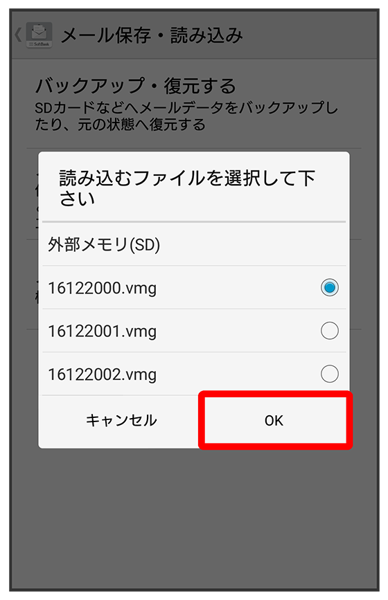 SDカードなどにエクスポートしたvMessage形式のメールデータを、本体にインポートします。