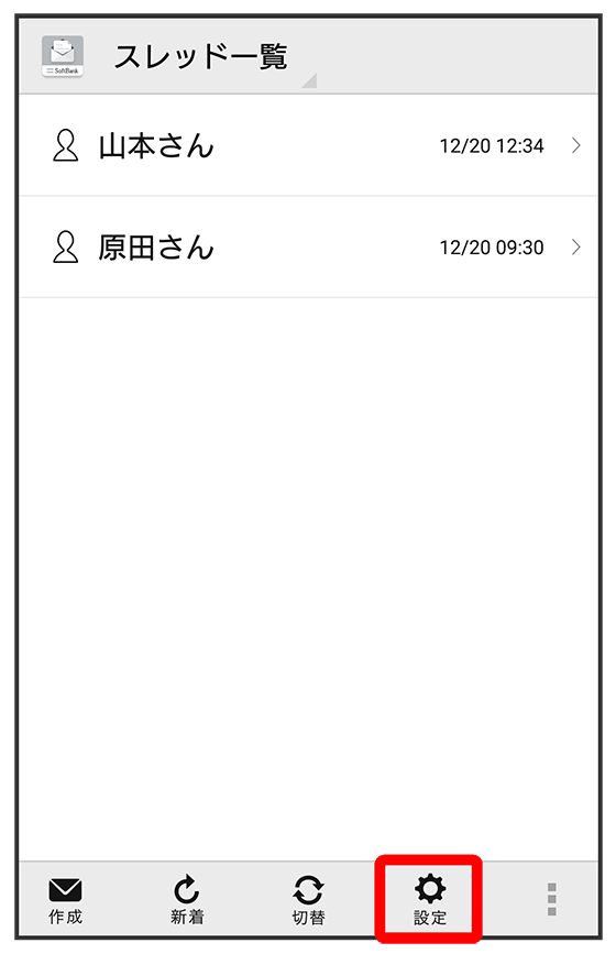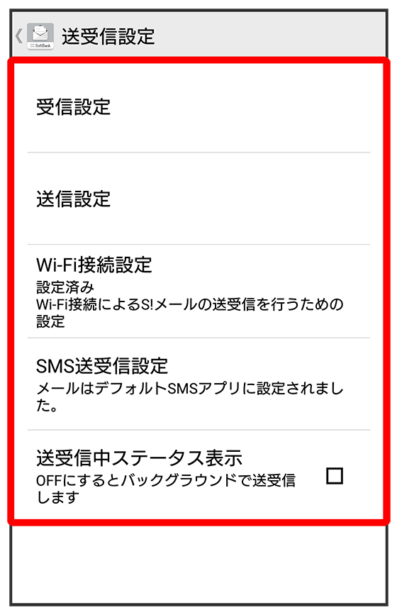 | 受信設定 | S!メール/SMS受信時の設定を行います。S!メールの一部を受信するとき、受信する内容を設定したり、S!メール起動時に自動で新着メールの確認をするかどうかを設定します。 |