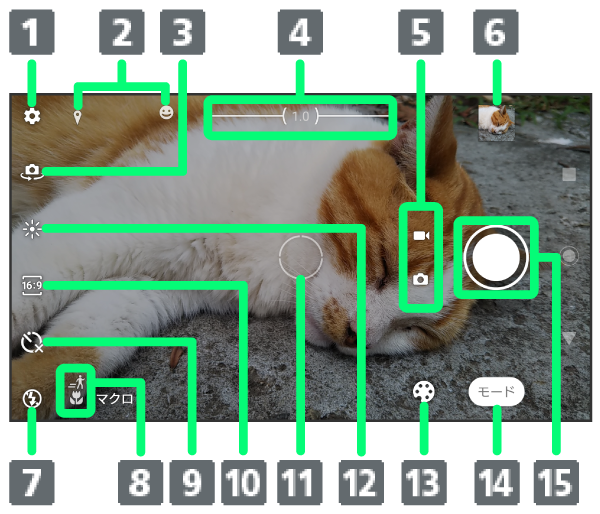 - シャッターアイコン(写真)/撮影開始/停止(動画)6
