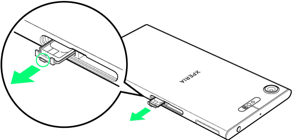 ミゾに指先をかけて、SIMカード/SDカード挿入口のカバーをまっすぐに引き出し、本体からSDカードトレイを取り外す