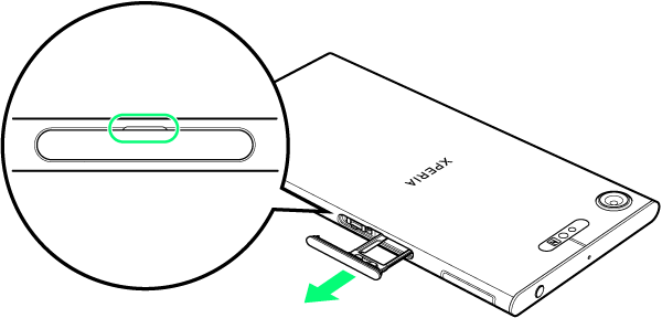 ミゾに指先をかけて、SIMカード/SDカード挿入口のカバーをまっすぐに引き出し、本体からSDカードトレイを取り外す