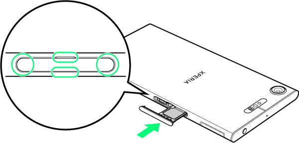 本体を水平にしてSDカードトレイをまっすぐに差し込み、SIMカード/SDカード挿入口のカバーの○部分をしっかりと押す