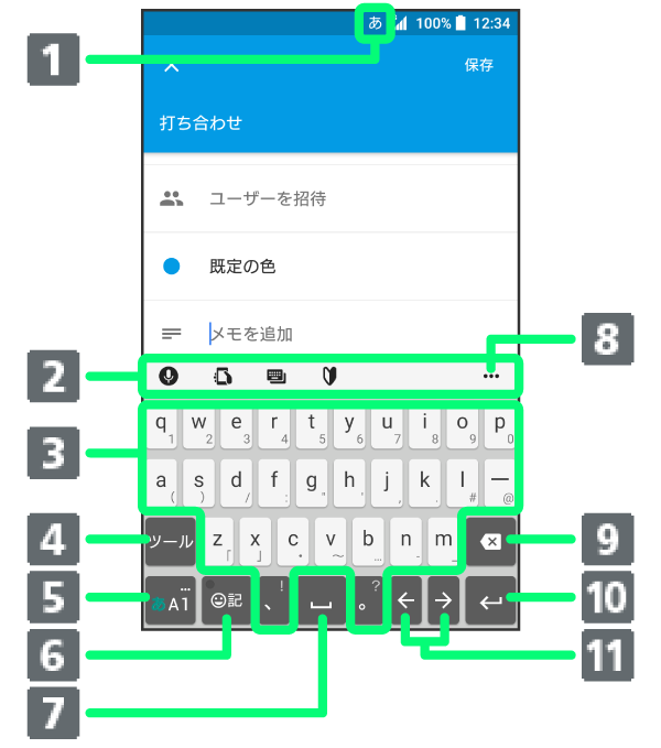 - 現在の文字入力モードが表示されます。