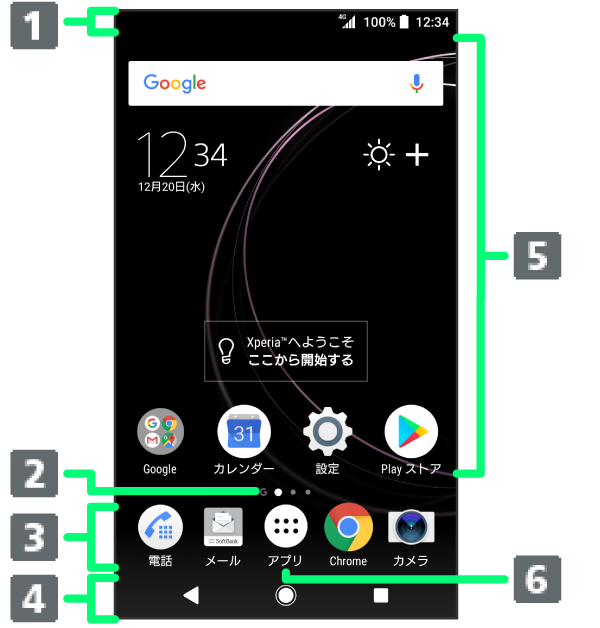 | ドック(Dock)メニュー | アイコンをタップすると、アプリや機能を起動できます。お好みのアプリのショートカットを最大4つまで設定できます。フォルダを設定することもできます。 |