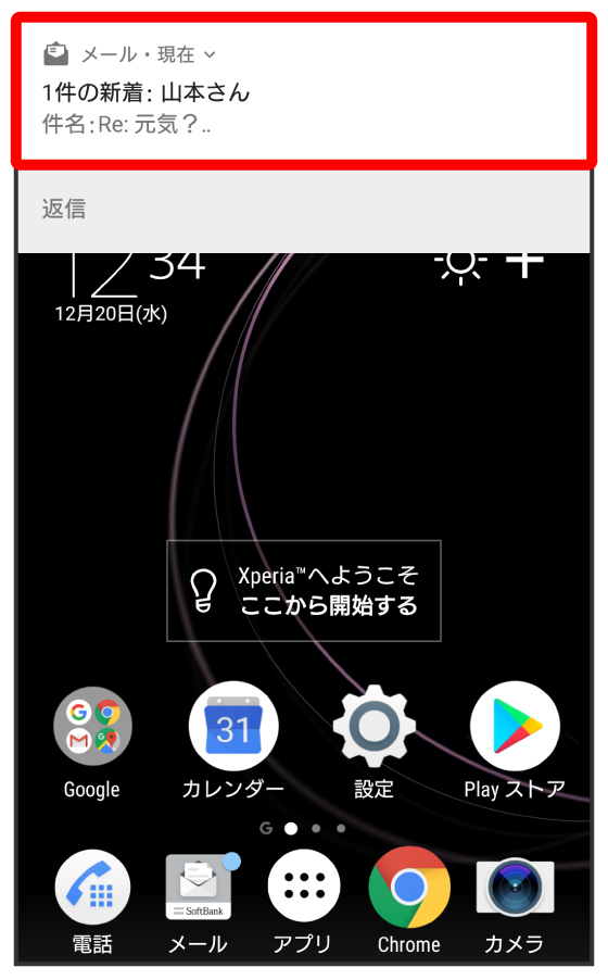 新着メールを受信すると、新着メッセージの通知と、通知アイコンが表示されます。
