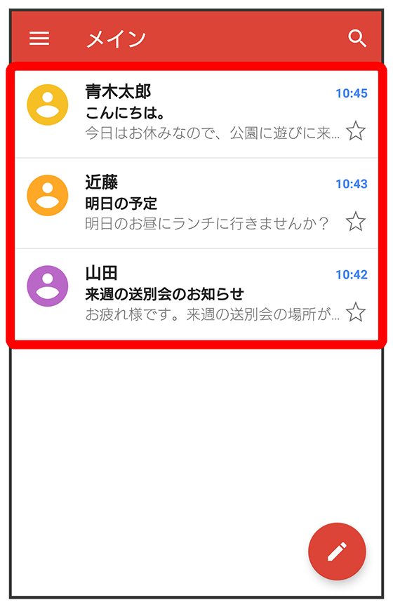 メール一覧画面で未読にするメールをロングタッチメールを削除する