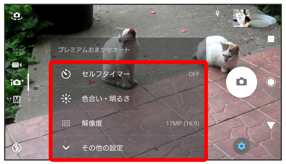 | 色合い・明るさ(「プレミアムおまかせオート」「ビデオ」設定時のみ) | 明るさと色合いを調整します。撮影画面に表示されたバーの 撮影画面で |