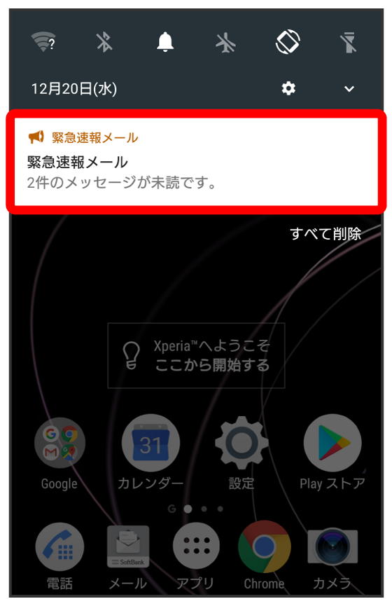 とメッセージが表示され、緊急地震速報の警告音/津波警報、災害・避難情報の専用着信音およびバイブレーションでお知らせします。