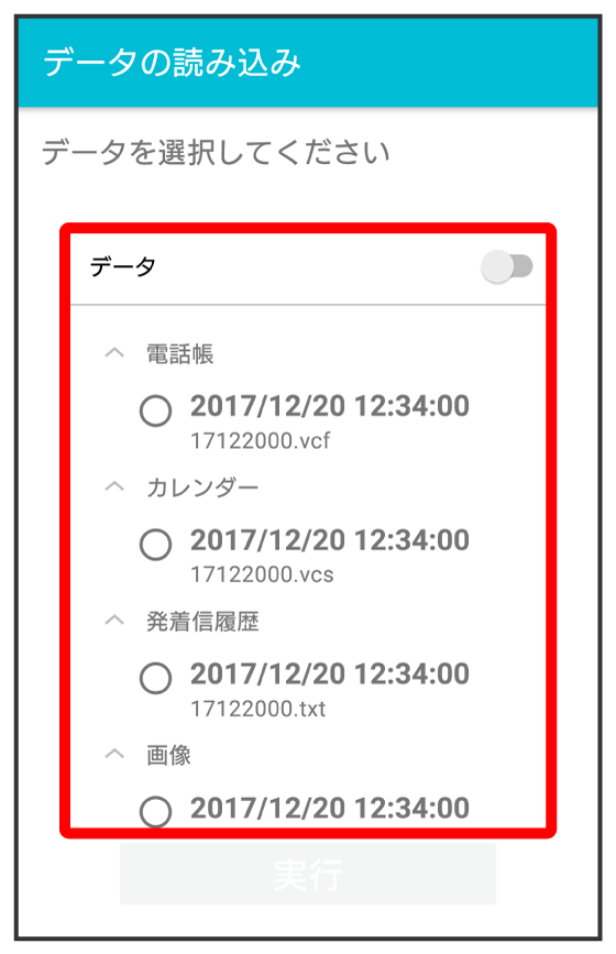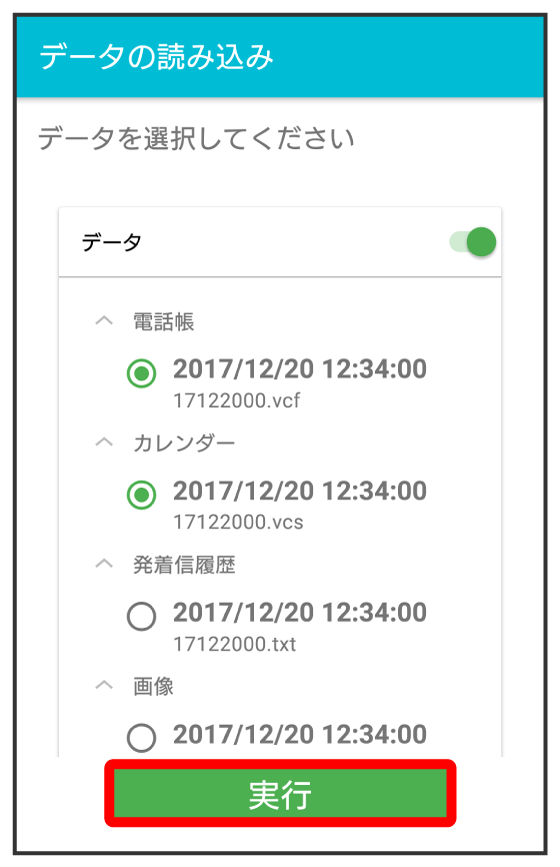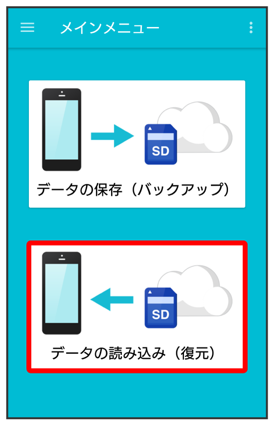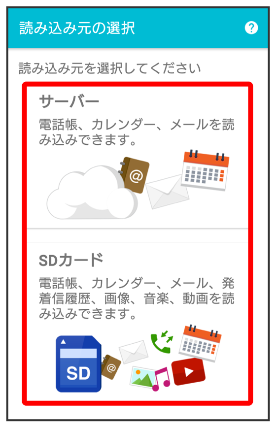 サーバー/SDカードに保存した電話帳データ/カレンダーデータ/発着信履歴データ/画像データ/音楽データ/動画データ/メールデータから、データを選択して本体に読み込むことができます。