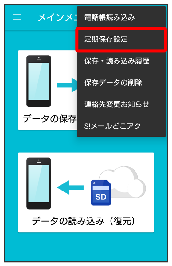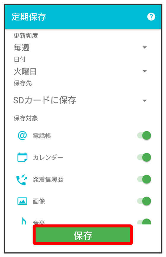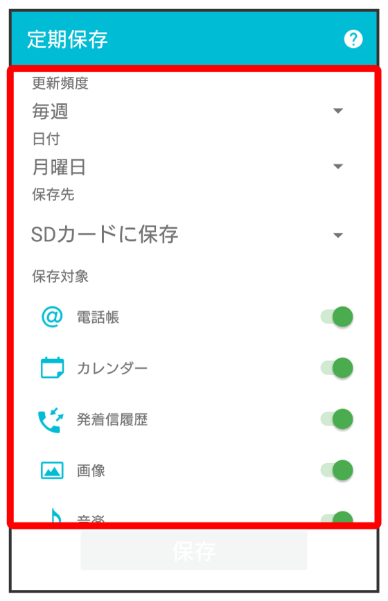 本体の電話帳データ/カレンダーデータ/発着信履歴データ/画像データ/音楽データ/動画データを、サーバー/SDカードに定期的に自動で保存します。