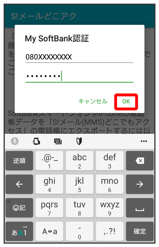 - はじめてエクスポートするときは、が表示されます。「S!メール(MMS)どこでもアクセス」にお申し込みが必要なときは、をタップし、画面の指示に従って操作してください。