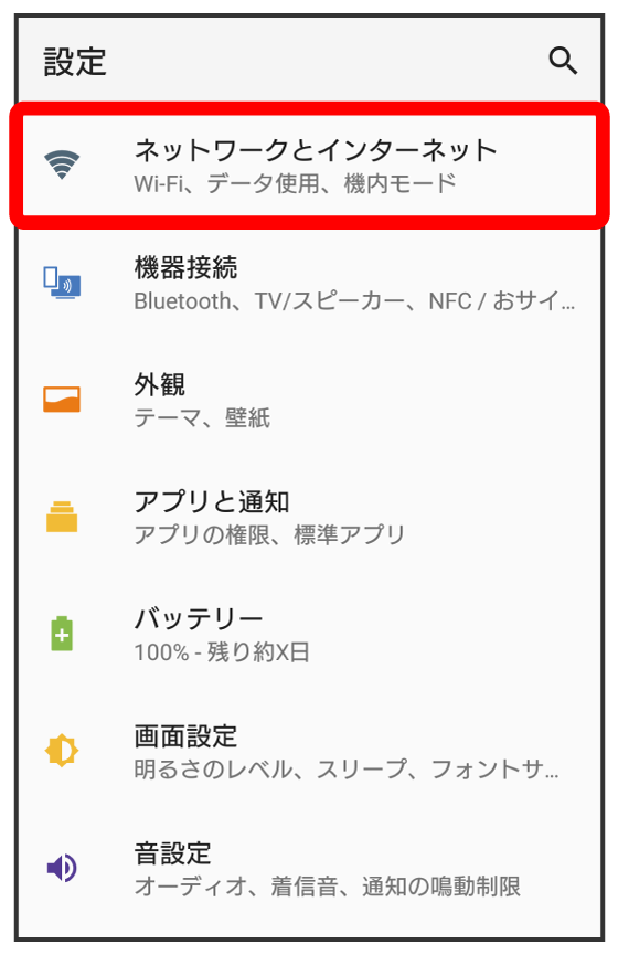 Wi-Fiやモバイルネットワーク、データ使用など、ネットワークやインターネットに関する設定ができます。設定できる項目は次のとおりです。