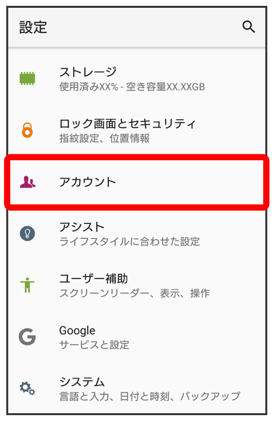 アカウント画面で、同期するアカウントをタップ同期する項目をタップ- 同期する項目をタップするたびに、設定(