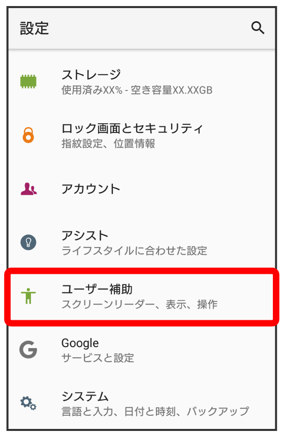 | ユーザー補助のショートカット | ユーザー補助の機能を、音量キーの上/下を同時に3秒以上長押しすることで起動できるように設定します。 |