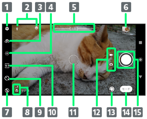 - シャッターアイコン(写真)/撮影開始/停止(動画)6