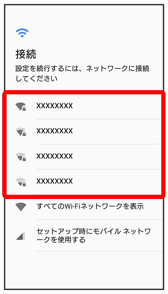 - Wi-Fiの設定を省略するときは、をタップします。以降は画面の指示に従って操作してください。