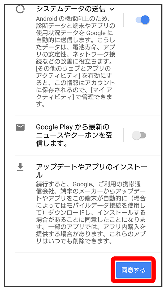 - をタップすると、Google アカウントを設定しているほかの端末からデータをコピーできます。画面の指示に従って操作してください。